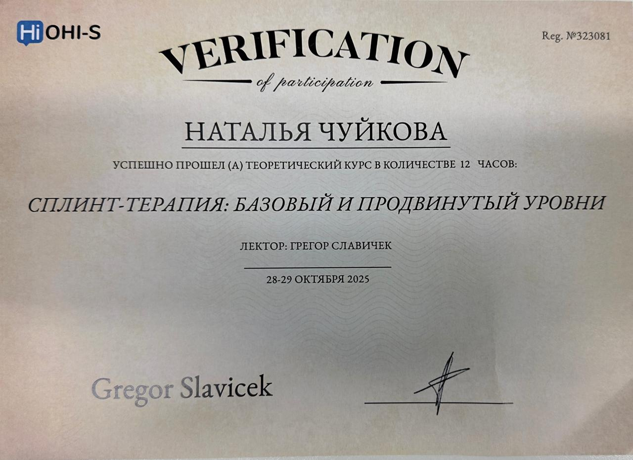 Сертификат «Сплинт-терапия: базовый и продвинутый уровни» - 2025 год